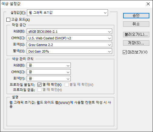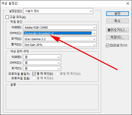 (미국 기준이면 "U.S. Web Coated (SWOP) v2" 선택)