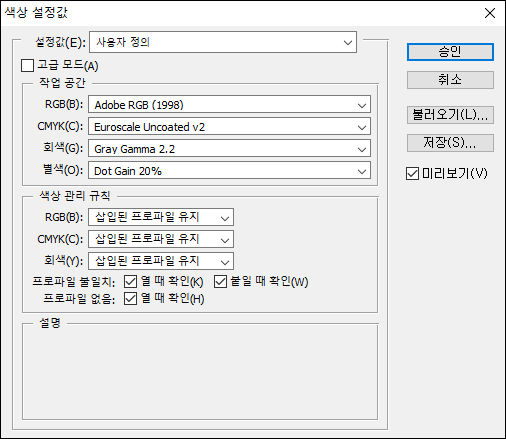 - RGB: 프로파일 유지 (Preserve Embedded Profiles)