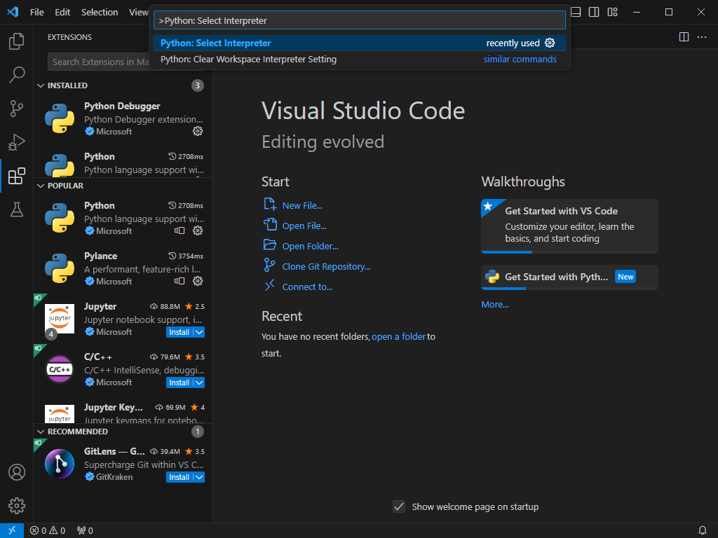 Python을 개발하기 위해서는 **Python 인터프리터(실행 환경)**를 선택해야 합니다. 인터프리터는 Python 코드가 실행될 환경을 의미하며, 특정 Python 버전 또는 가상 환경을 선택할 수 있습니다.