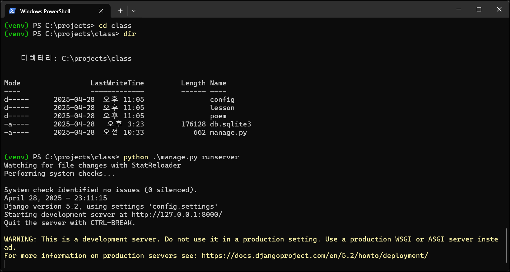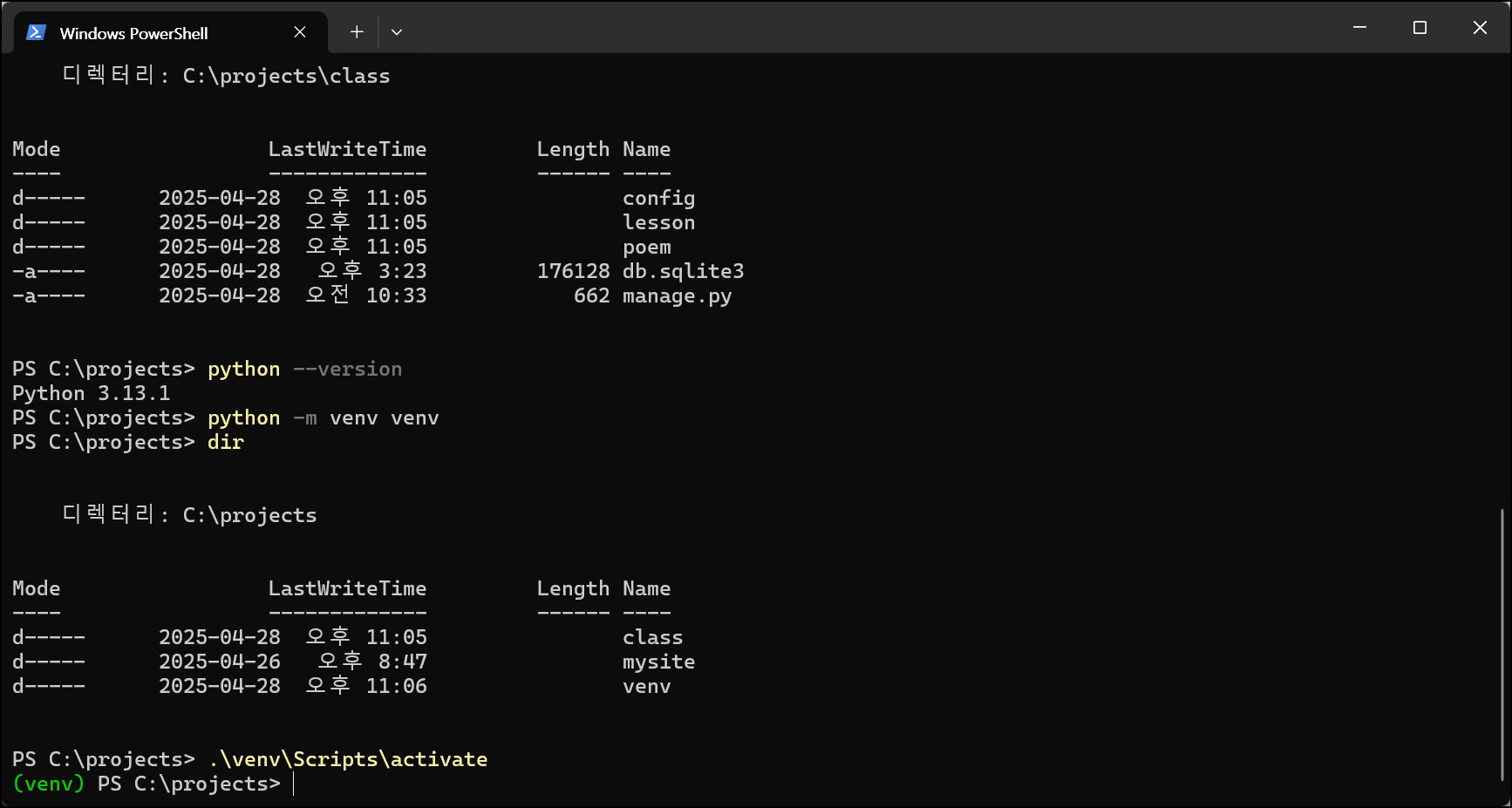 ✅ 프롬프트에 (venv)처럼 표시가 뜨면 성공입니다.