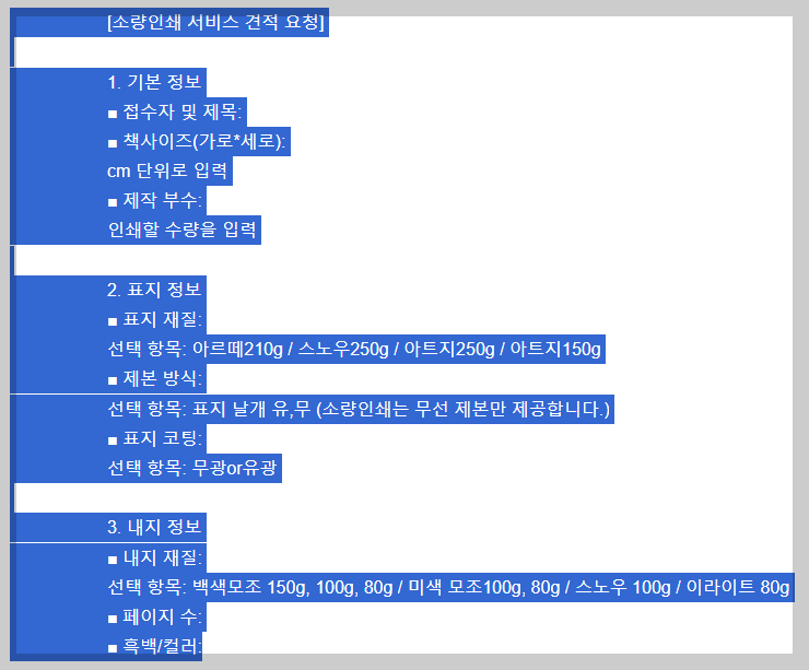 위와 같은 구성은 소량 제작 도서를 준비할 때 필요한 모든 요소를 상세히 설정할 수 있도록 체계화된 기준을 제공합니다. 이를 통해 사용자는 책의 품질과 예산을 조율하며 최적의 결과를 얻을 수 있습니다.