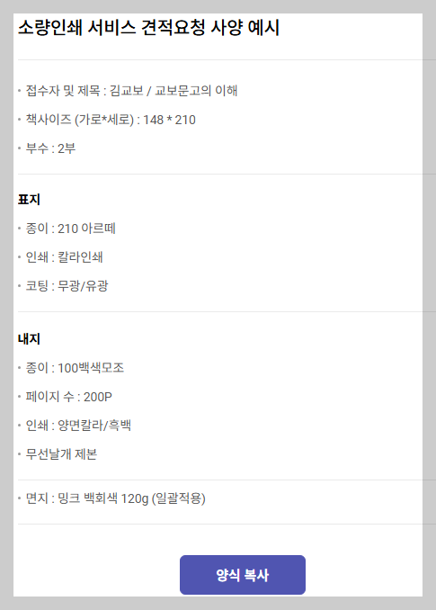 다음 이미지에 있는 소량 인쇄 서비스 견적 요청 사양 예시에 나온 각 항목에 대한 설명은 다음과 같습니다.