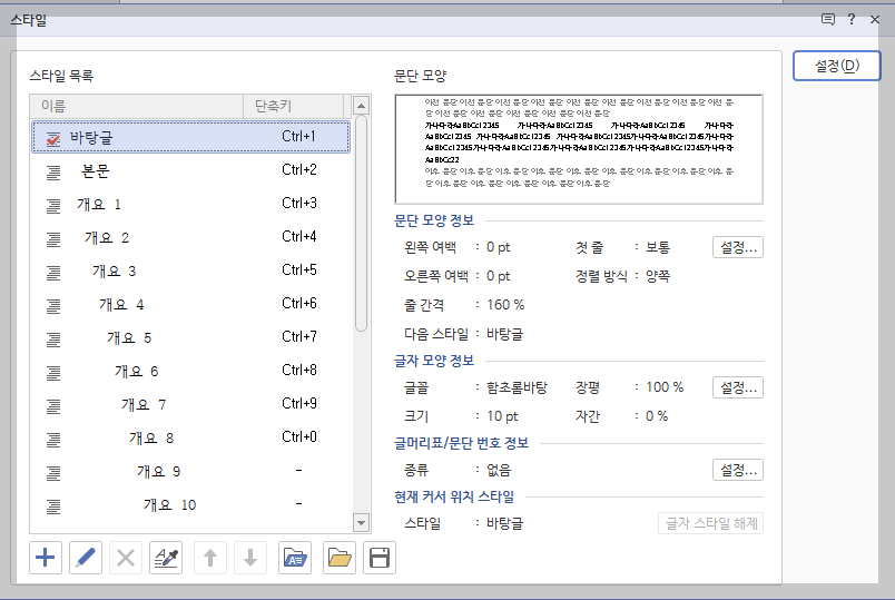 기본으로 제공된 바탕글과 본문은 아래한글 워드프로세서가 추구하는 기본 방향에 맞춰 설정되어 있으므로 그대로 살려두고 스타일 적용의 문제가 발생했을 때 활용하도록 합니다. 아래쪽에 배치된 특수한 기능의 스타일도 그대로 두고 중간 '개요'를 모두 없애고 원하는 양식을 만들어 사용하도록 합니다. 개요는 무료 10개 항목이 구조적으로 조직되어 있습니다.