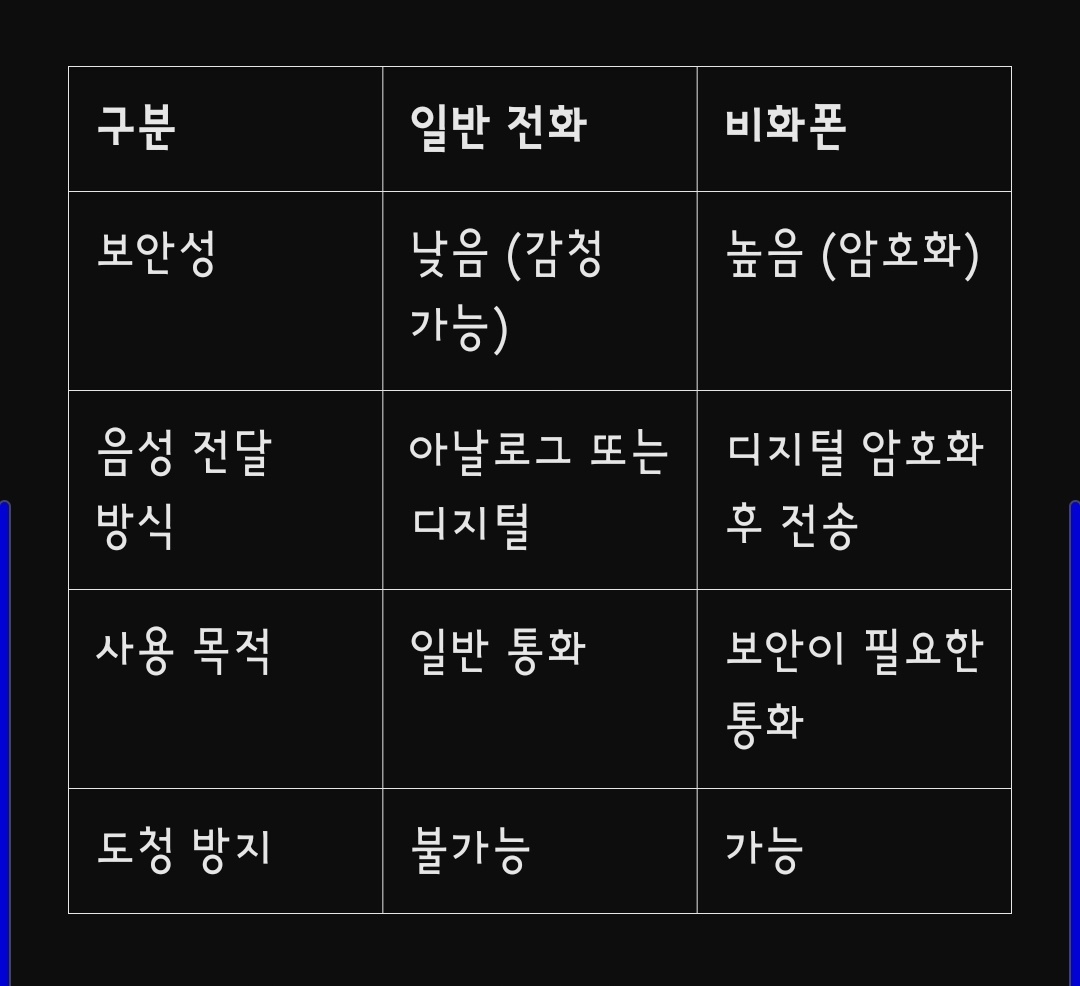 비화폰(秘話phone, Secure Phone)은 도청이나 감청을 방지하기 위해 음성을 암호화하여 송수신하는 보안 통신 장치입니다.