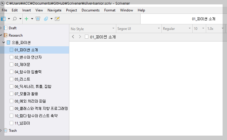 Scrivener에서 계층적으로 문서를 정리할 수 있습니다. 현재 '01_파이썬 소개'는 Research 폴더 아래에 위치한 문서인데, 문서를 추가하려면 '01_파이썬 소개'를 폴더로 변경해야 합니다.